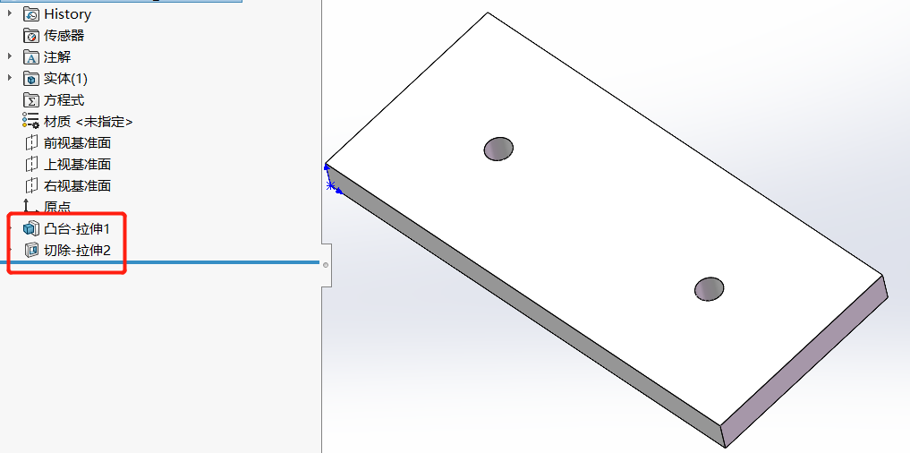2、假如上图中的两个孔,在一定情况下会没有,那我们在建模时,就不要在一个拉伸中将孔做出来,而是先拉伸凸台,再去做孔的切除特征。
